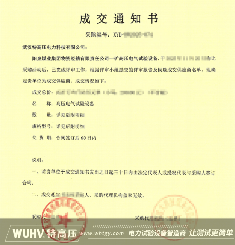 近日,武漢特高壓正式收到《成交通知書》,確認(rèn)中標(biāo)陽(yáng)泉煤業(yè)集團(tuán)物資經(jīng)銷有限責(zé)任公司一礦高壓電氣試驗(yàn)設(shè)備采購(gòu)項(xiàng)目。這一成果的背后,是武漢特高壓團(tuán)隊(duì)對(duì)客戶需求的精準(zhǔn)把握、對(duì)投標(biāo)流程的嚴(yán)謹(jǐn)執(zhí)行以及對(duì)服務(wù)質(zhì)量的不懈追求。
