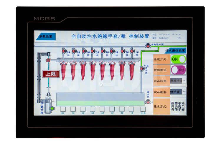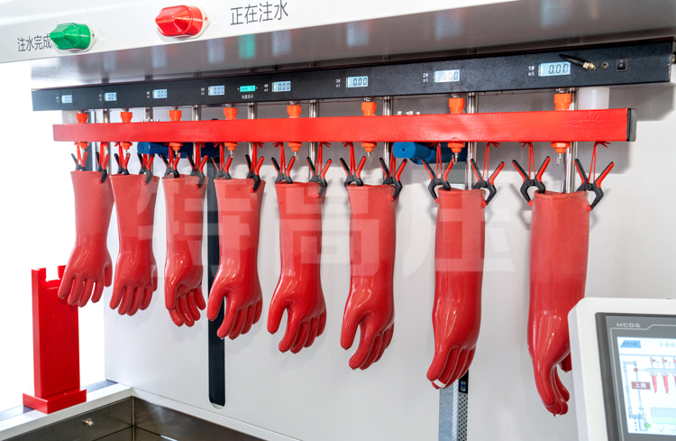 - 2、絕緣手套試驗(yàn)時(shí),注水采用全自動(dòng)注水方式,試驗(yàn)人員只需按要求安裝好手套,在注水裝置的設(shè)置界面中選擇絕緣手套的級(jí)別后,注水裝置依據(jù)《DL/T1476-2015電力安全工器具預(yù)防性試驗(yàn)規(guī)程》、《GB/T17622-2008帶電作業(yè)絕緣手套》等自動(dòng)設(shè)定手套袖口到水面的距離后注水,待水套注水完成后,注水裝置向水槽內(nèi)注水,最終保證手套內(nèi)外水面一致。