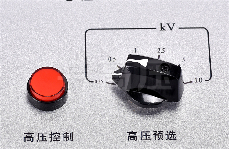 - 4、高壓輸出范圍寬廣:可選擇0.25kV、0.5kV、1kV、2.5kV、5kV、10kV,也可從0V平滑調節(jié)到需要的電壓。